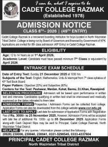 Cadet College Razmak is one of the leading Institution of the country, which earned its name through sheer dedication, perseverance and hard work. The college underwent many ups and downs during the last four decades, Alhamdolillah it is shaping up well now; The performance and contribution of Razmians in all spheres of national life is commendable and a source of inspiration and pride for the institution.